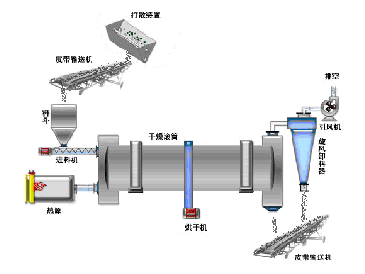 干燥的濕物料由皮帶輸送機(jī)或斗式提升機(jī)送到料斗,然后經(jīng)料斗的加料機(jī)通過加料管道進(jìn)入加料端。加料管道的斜度要大于物料的自然傾角,以便物料順利流入干燥器內(nèi)。干燥器圓筒是一個(gè)與水平線略成傾斜的旋轉(zhuǎn)圓筒。物料從較高一端加入,載熱體由低端進(jìn)入,與物料成逆流接觸,也有載熱體和物料一起并流進(jìn)入筒體的。隨著圓筒的轉(zhuǎn)動(dòng)物料受重力作用運(yùn)行到較底的一端。濕物料在筒體內(nèi)向前移動(dòng)過程中,直接或間接得到了載熱體的給熱,使?jié)裎锪系靡愿稍?,然后在出料端?jīng)皮帶機(jī)或螺旋輸送機(jī)送出。在筒體內(nèi)壁上裝有抄板,它的作用是把物料抄起來又撒下,使物料與氣流的接觸表面增大,以提高干燥速率并促進(jìn)物料前進(jìn)。載熱體一般分為熱空氣、煙道氣等。載熱體經(jīng)干燥器以后,一般需要旋風(fēng)除塵器將氣體內(nèi)所帶物料捕集下來。如需進(jìn)一步減少尾氣含塵量,還應(yīng)經(jīng)過袋式除塵器或濕法除塵器后再放排放。